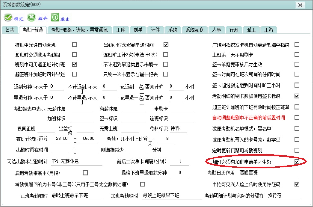 1.进入“系统管理→参数设定→考勤-普通”,勾选“加班必须有加班申请单才生效”。