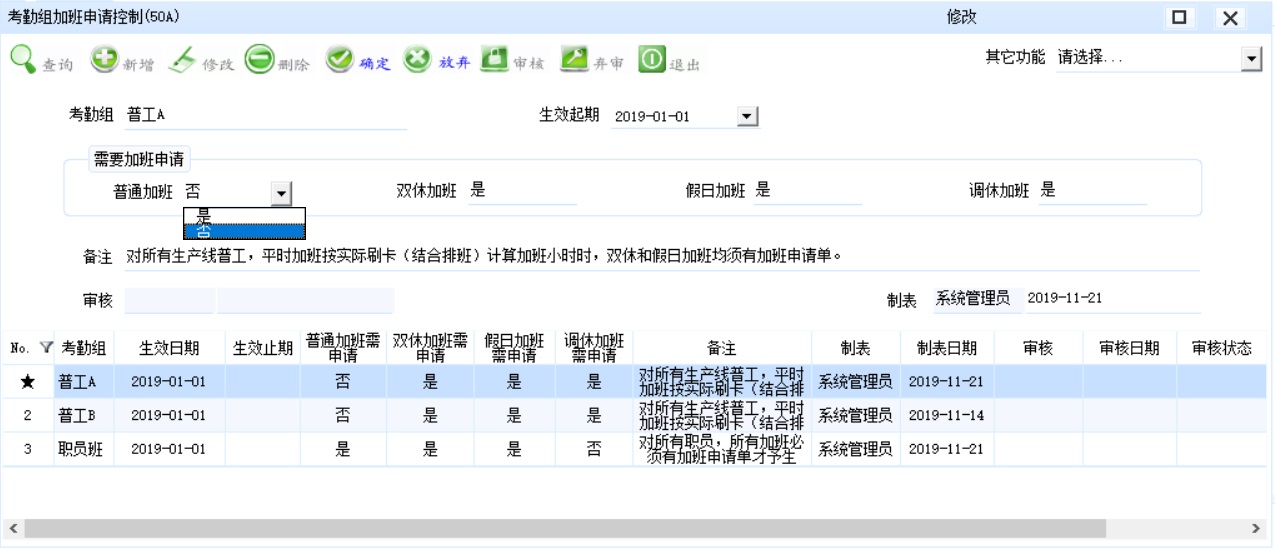 (2)生产车间普工类,因为生产需要,普遍存在平时晚上加班的情况,可以放开对其这类加班的管控,即不需要填写加班申请单,按员工实际加班刷卡时间计算——当然,这不是说完全不受控的,而是受你设置的班别里的加班时间段和班段判定规则有关(即如果设定的班别里加班时间限制了3小时,员工即使刷4小时也是无效的),同时对周末加班和假日加班进行管控。这样可以减少一些加班申请单提交的工作量。