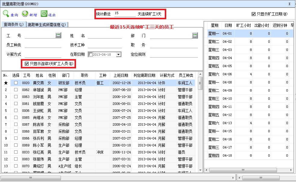 在不输入/选择任何查询条件下点查询,系统默认呈现的是最近15天内连续旷工3天的员工(方便批量处理自动离职问题)。也可以将这些条件去掉,选择自己需要的条件后点查询,表内显示所有符合条件的人员。